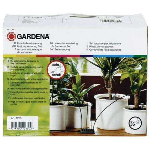 Gardena vakantiebewatering. Automatisch druppel voor druppel watergeven aan maximaal 36 potplanten. De ideale oppas tijdens vakanties. Watervoorziening middels voorraadvat met pomp. 3 Druppelverdelers met verschillende waterafgifte en 12 uitgangen om gericht en nauwkeurig gedoseerd planten water te geven. Voor max. 36 potplanten. Transformator met tijdschakelaar zet besproeiing dagelijks 1 minuut in werking. Waterafgifte per verdeleruitgang: Lichtgrijze verdeler 15 ml/min. Middelgrijze verdeler 30 ml/min. Donkergrijze verdeler 60 ml/min. Ingekapselde laagspanningstransformator (14 V) voor binnens- en buitenshuis gebruik, Slanghouders voor het fixeren van maximaal 3 druppelslangen per pot.